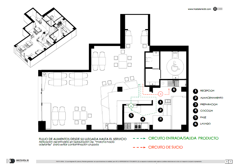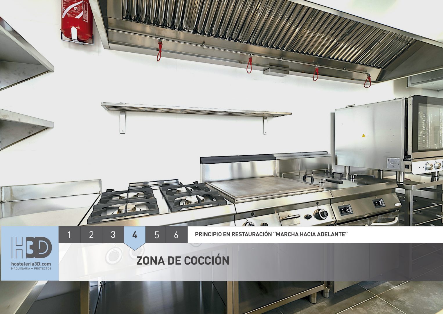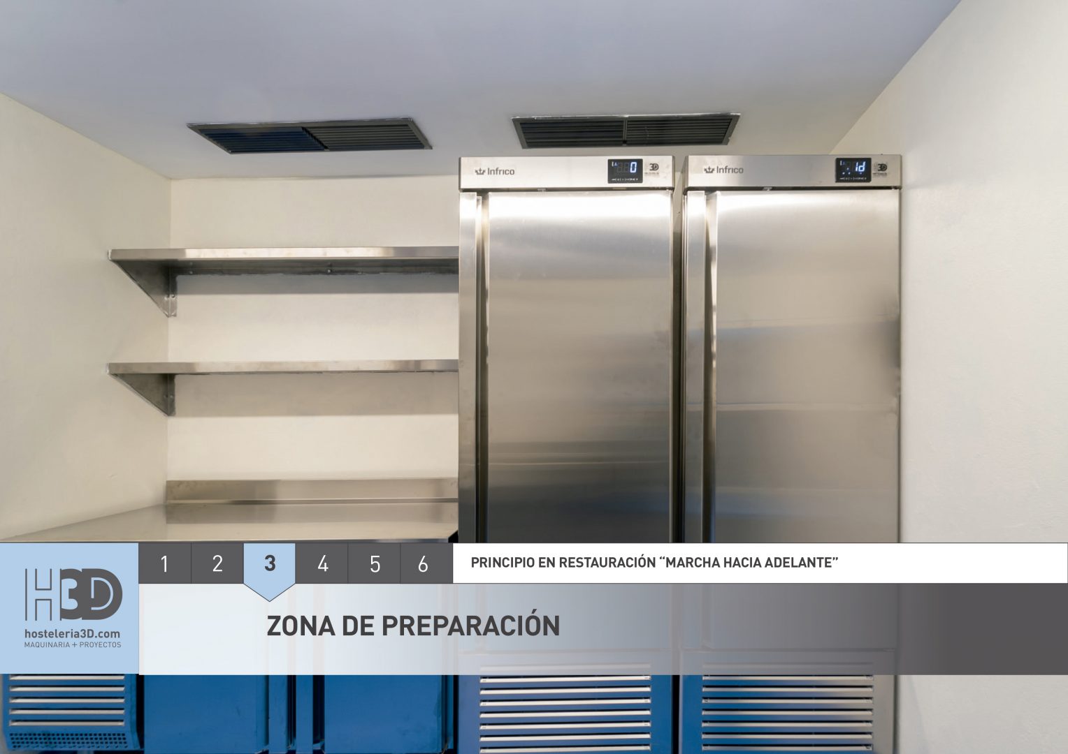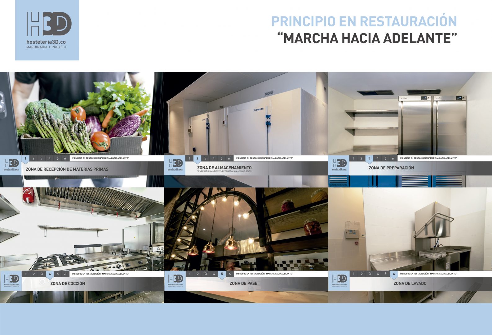 En un proyecto de equipamiento de maquinaria de hostelería para cocinas industriales se debe tener en cuenta “el principio marcha hacia adelante”, principio de organización fundamental sobre el que diseñamos la instalación y destinado a evitar contaminación entre los alimentos durante su preparación y manipulación.