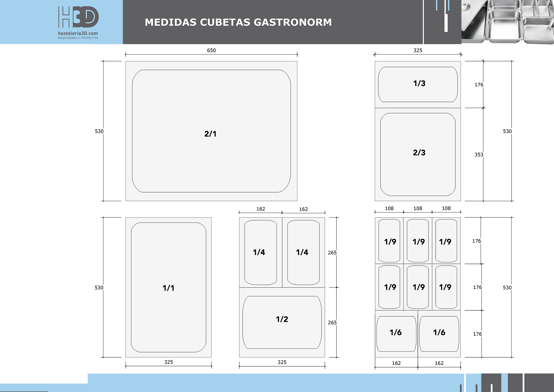 El sistema de recipientes gastronorm está basado en los modelos de medidas GN 1/1 (530×325 mm) y GN 2/1 (325x265mm). Con éstas medidas como base se realizan subdivisiones para conseguir distintas combinaciones.
