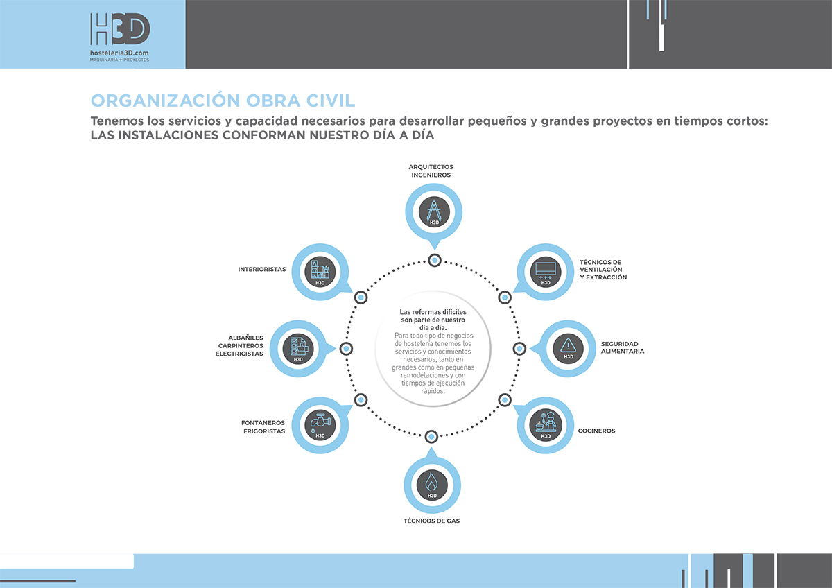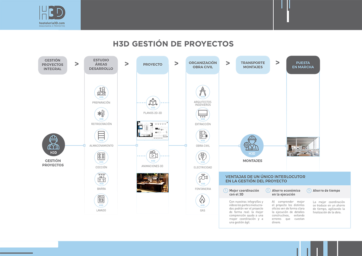 El equipamiento de una cocina industrial y la venta de maquinaria para hostelería tiene una complejidad específica, debido a la necesidad de tener conocimientos en varias disciplinas no solo relacionadas con los equipos, sino con el modelo de negocio y la normativa específica de la maquinaria. En H3D somos conscientes de lo que implica una instalación y su gestión integral, desarrollando un proceso sistematizado que te permite a través de un único interlocutor gestionar el proyecto con los distintos oficios.