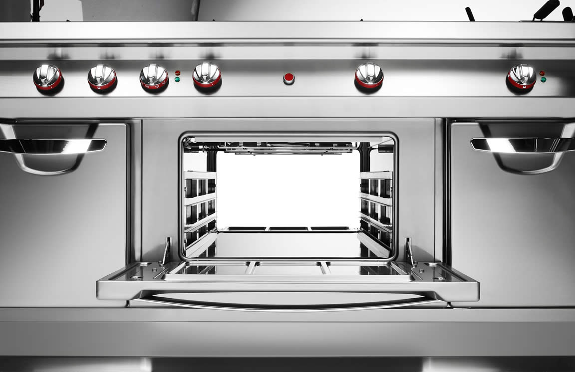 Omega es la serie que cuenta con 110 cms. de profundidad, diseñada para satisfacer la necesidad de colocar la cocina en una isla en el centro y garantizar la máxima eficacia del trabajo en ambos frentes. Gracias a que los controles están ubicados en ambos frentes, a los hornos pasantes y a la ubicación central de los quemadores y las campanas, resulta versátil y capaz de facilitar el trabajo simultáneo de varios cocineros.
