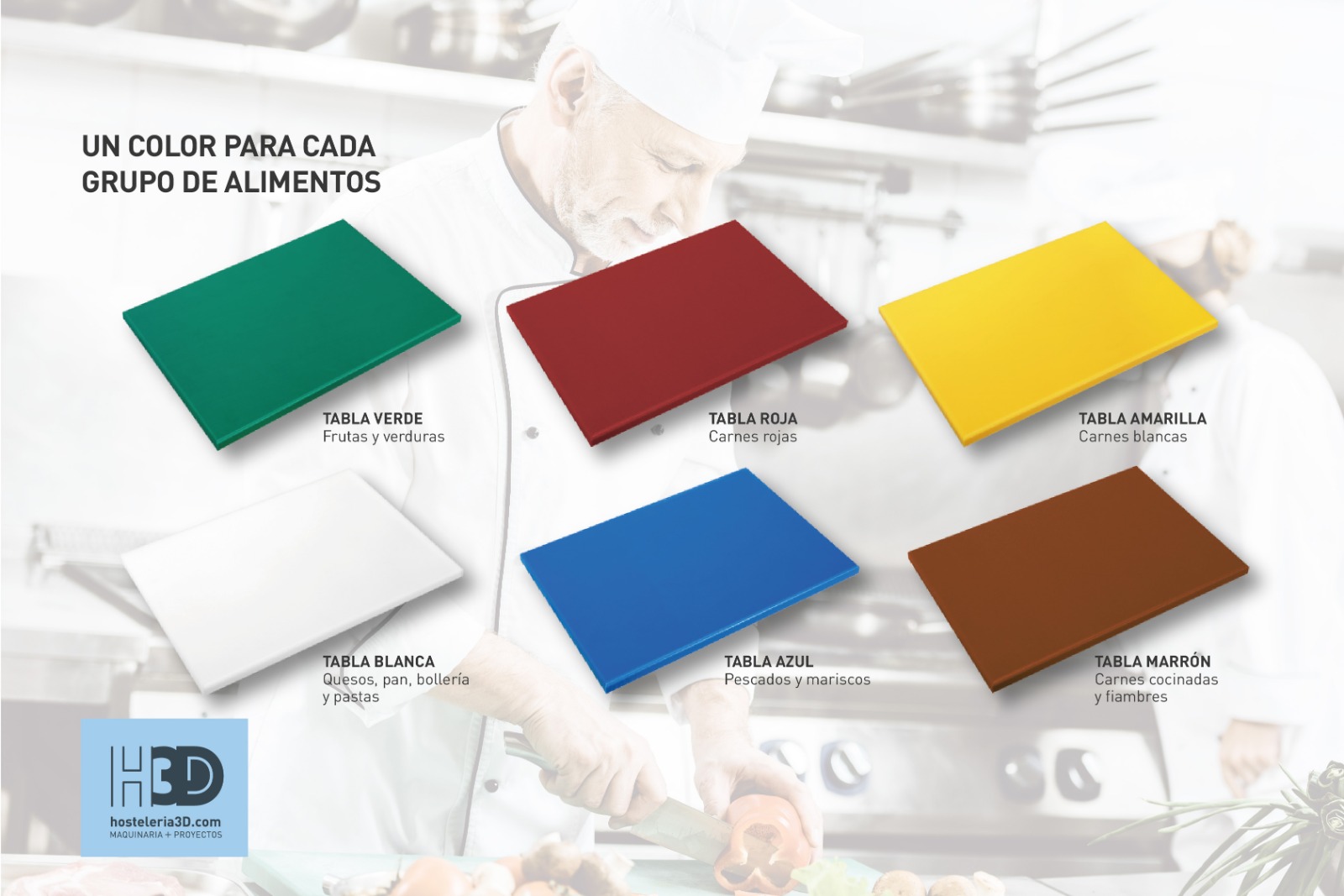 En las cocinas profesionales son utilizadas para identificar los alimentos que se deben cortar en cada uno de ellas. Mediante una codificación de colores clasificamos los alimentos según tipología, utilizando siempre los mismos utensilios o tablas de corte para cada alimento, evitando la contaminación cruzada y la mezcla de olores y sabores. Además, tendremos una superficie estable y plana para poder cortar de forma segura.