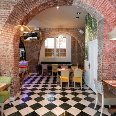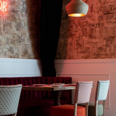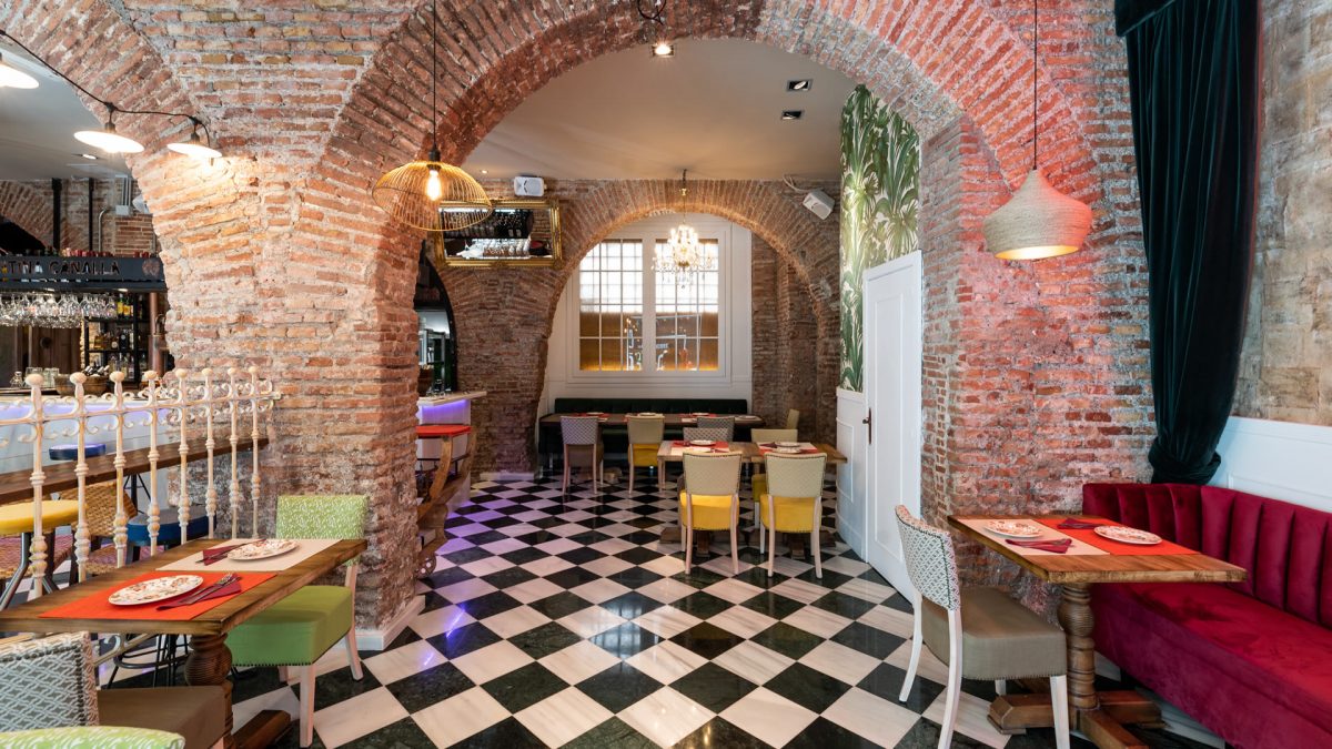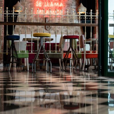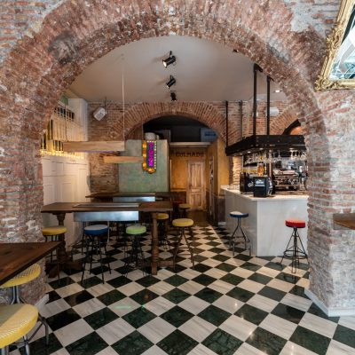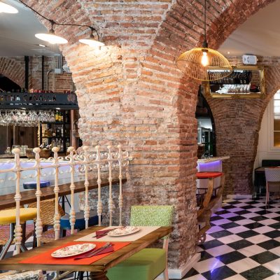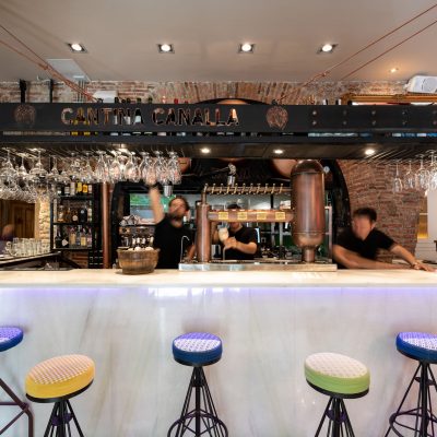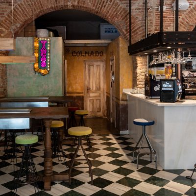 Todo el espacio se enmarcó en un fantástico espacio con techos de 5 metros de altura, con varios arcos centrales y ladrillo en las paredes, estructuras y materiales existentes que se respetaron y restauraron en los lugares donde fue necesario.Referencias a la cultura mexicana la encontramos en un neón con la inscripción “tacos”, en su gráfica y en la aplicación de colores vivos tanto en la sala como en la zona de baños, ampliamente utilizados en la paleta de colores tradicional de México. Espejos, tubas, lámparas y televisores antiguos, mobiliario colorido… son más de los detalles que encontramos en Cantina Canalla, que junto con una cuidada iluminación transmiten al lugar confort en un ambiente desenfadado, vivo y alegre.