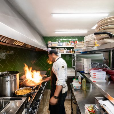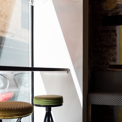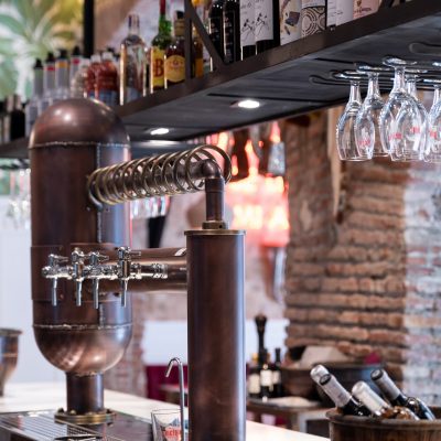 En la zona de barra, una estructura suspendida de hierro fabricada expresamente con detalles en la tornillería que merecen ser apreciados, y un mueble construido en acero inoxidable y fabricado a medida, equipado con todo lo necesario para estación de cócteles y adaptado a la forma de trabajar del equipo de Cantina Canalla. Finalmente conviene destacar el dispensador de la clásica cerveza malagueña Victoria, fabricado en cobre y toda una pieza de colección.