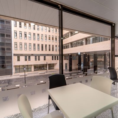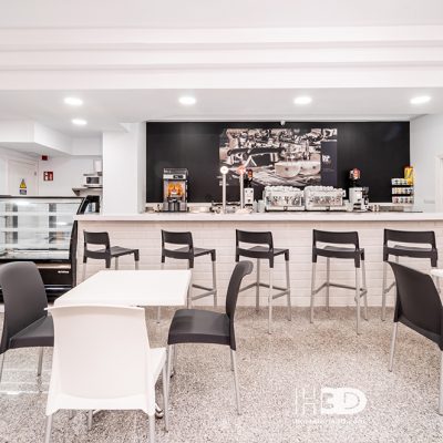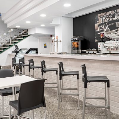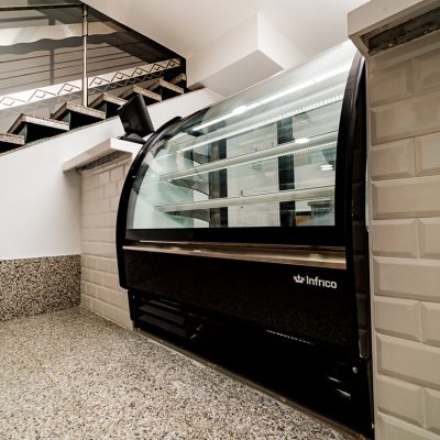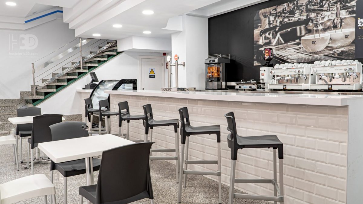 Abordamos el espacio con una distinción que ya viene marcada claramente por la existencia de 2 plantas. En la primera planta ubicamos justo a la entrada una vitrina modelo Ámbar de Infrico, con el objetivo de conseguir que el público encontrase nada más entrar toda la oferta de bocadillos y pastelería que ofrece HR Café. Una gran barra a continuación permite al público en general y al personal sanitario tomar un café rápido y de forma informal. Terminada la barra llegamos a la cocina, donde en la zona de cocción la maquinaria de hostelería instalada ha sido un Frytop y Cocina de 4 fuegos de la marca Repagas y horno Giorik de Eurofred en cocción y bajomostrador y armarios de hostelería de Infrico.