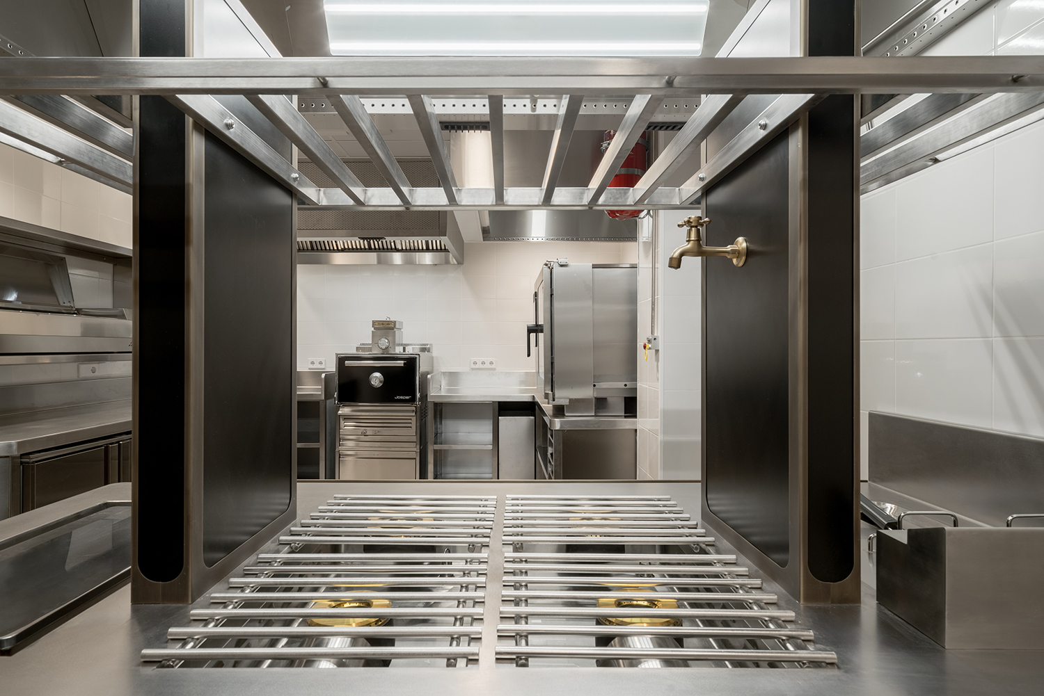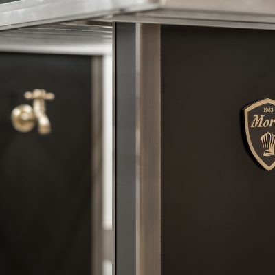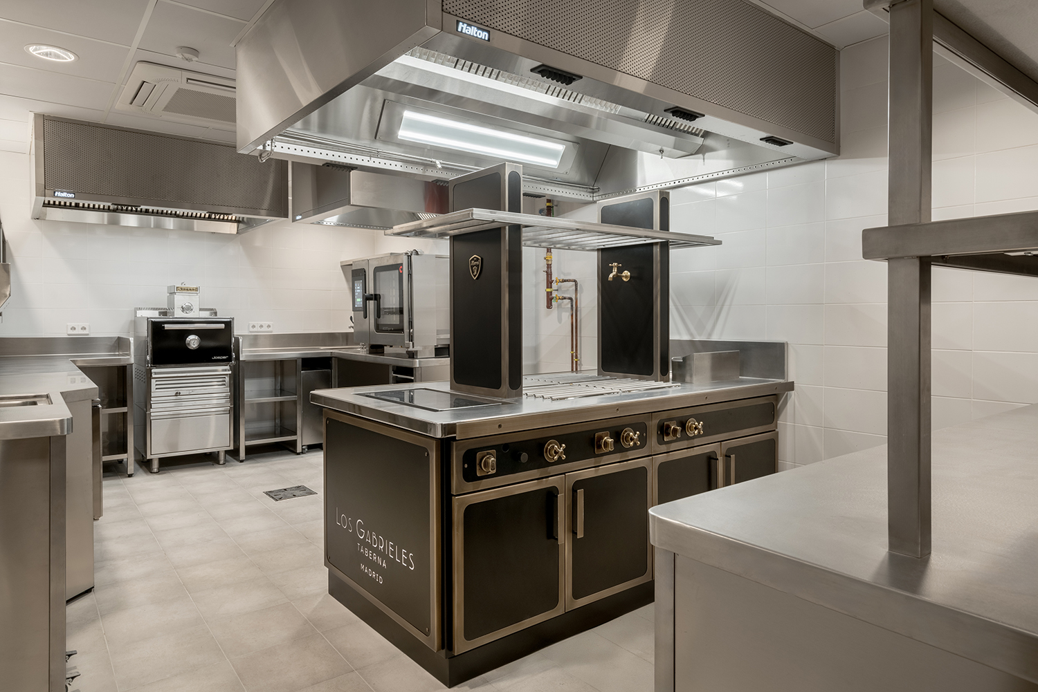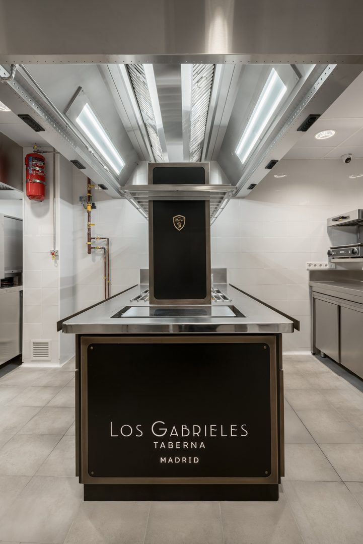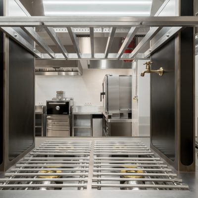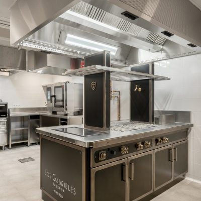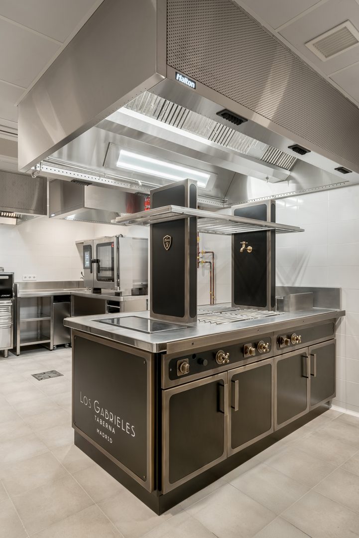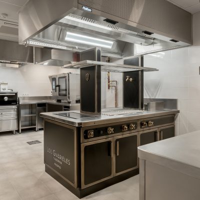 - Cocción Horizontal: Una isla central fabricada por MOREI, personalizada en color negro y detalles en latón, que invitan al desarrollo de la creatividad de los chefs con un diseño personalizado caracterizado por su eficiencia y ergonomía.