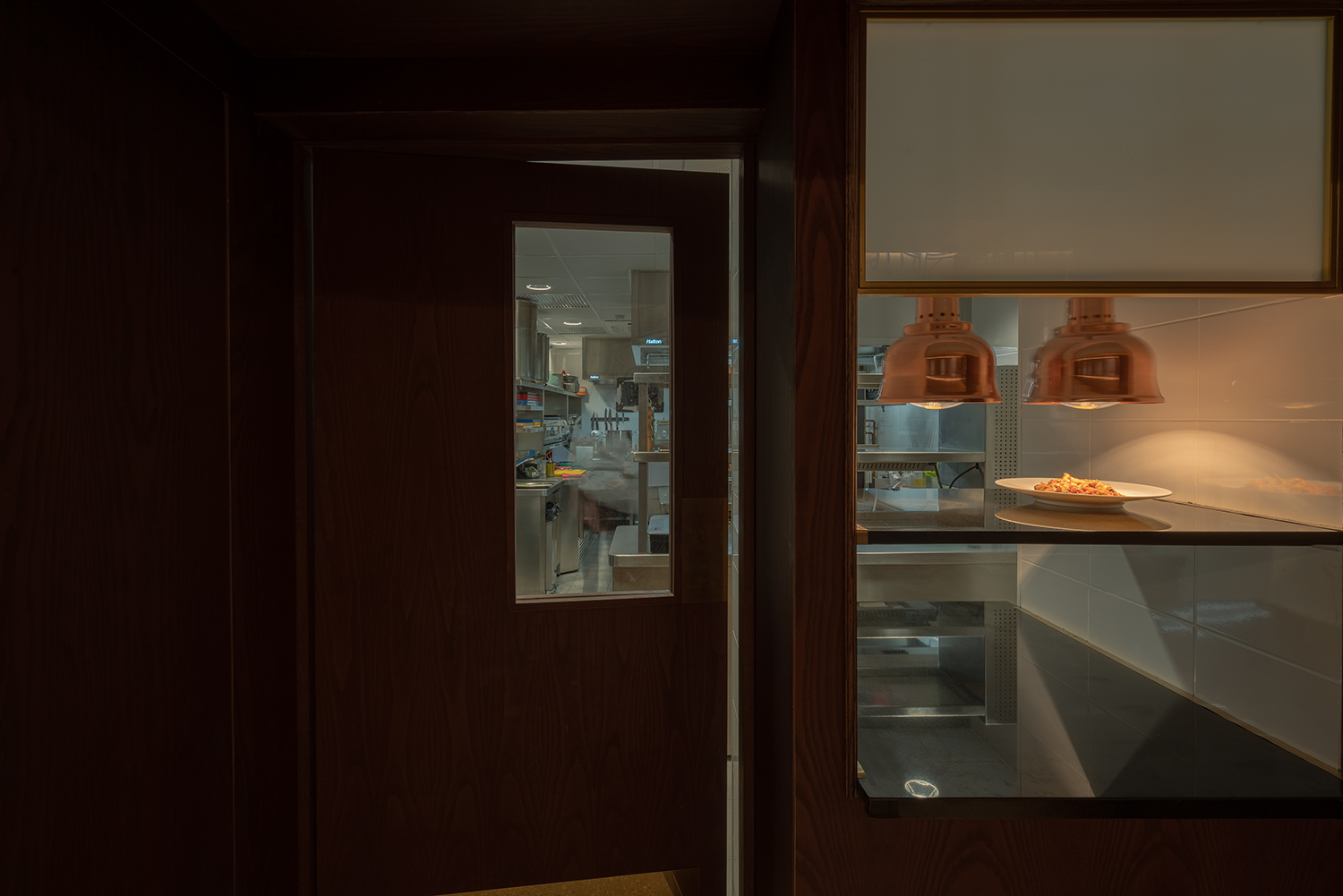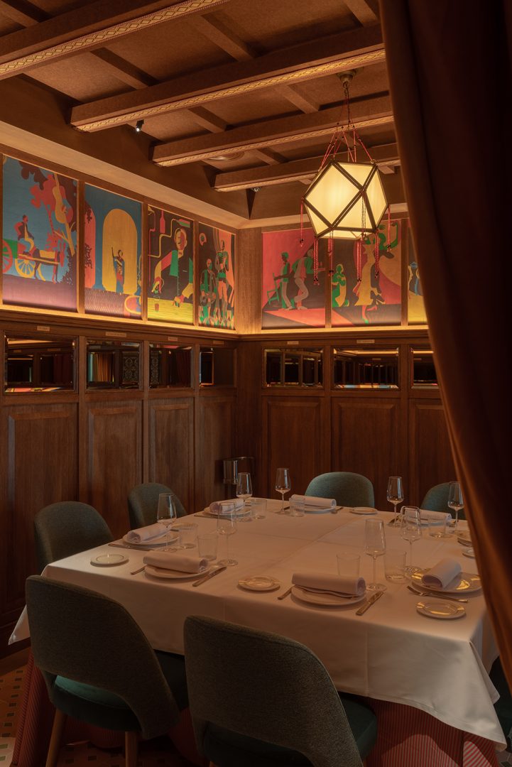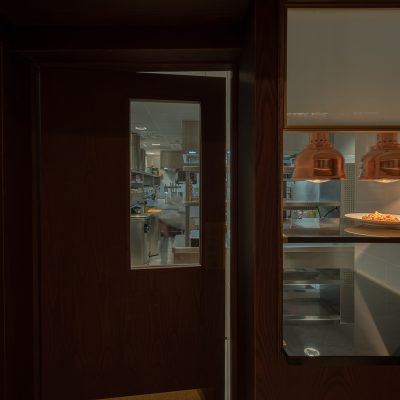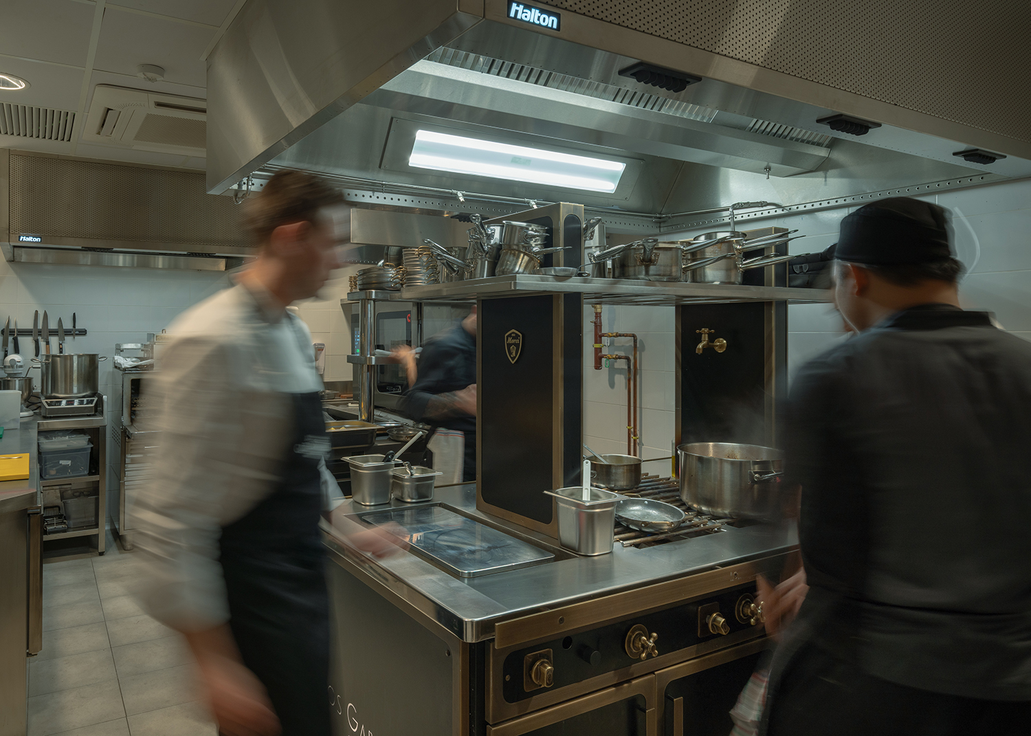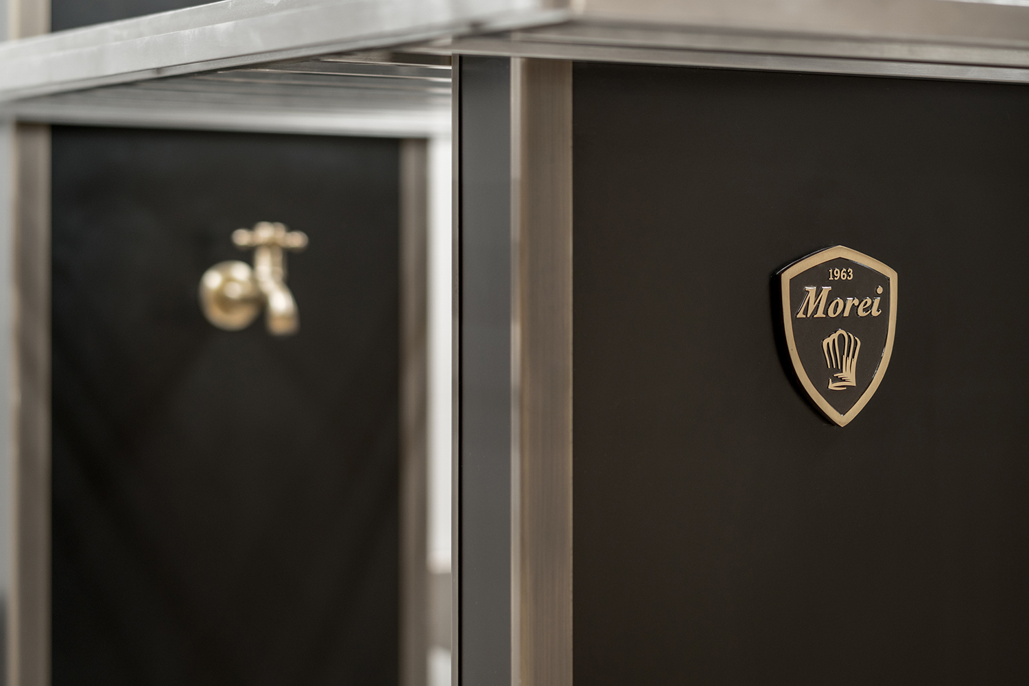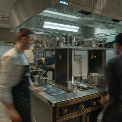 - Cocción Horizontal: Una isla central fabricada por MOREI, personalizada en color negro y detalles en latón, que invitan al desarrollo de la creatividad de los chefs con un diseño personalizado caracterizado por su eficiencia y ergonomía.