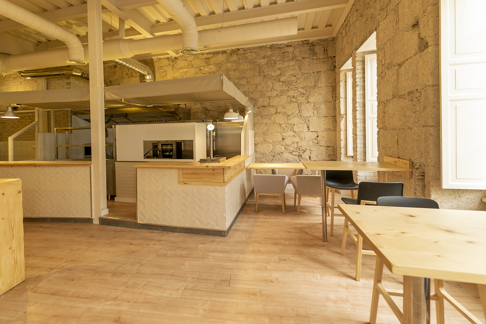 Proyecto donde cada centímetro es imprescindible, debido sobre todo a las dimensiones de cada puesto. Todos están dotados para la realización de sus actividades de bajomostradores, congeladores, planchas, freidoras y zona de lavado con fregadero y lavaplatos.